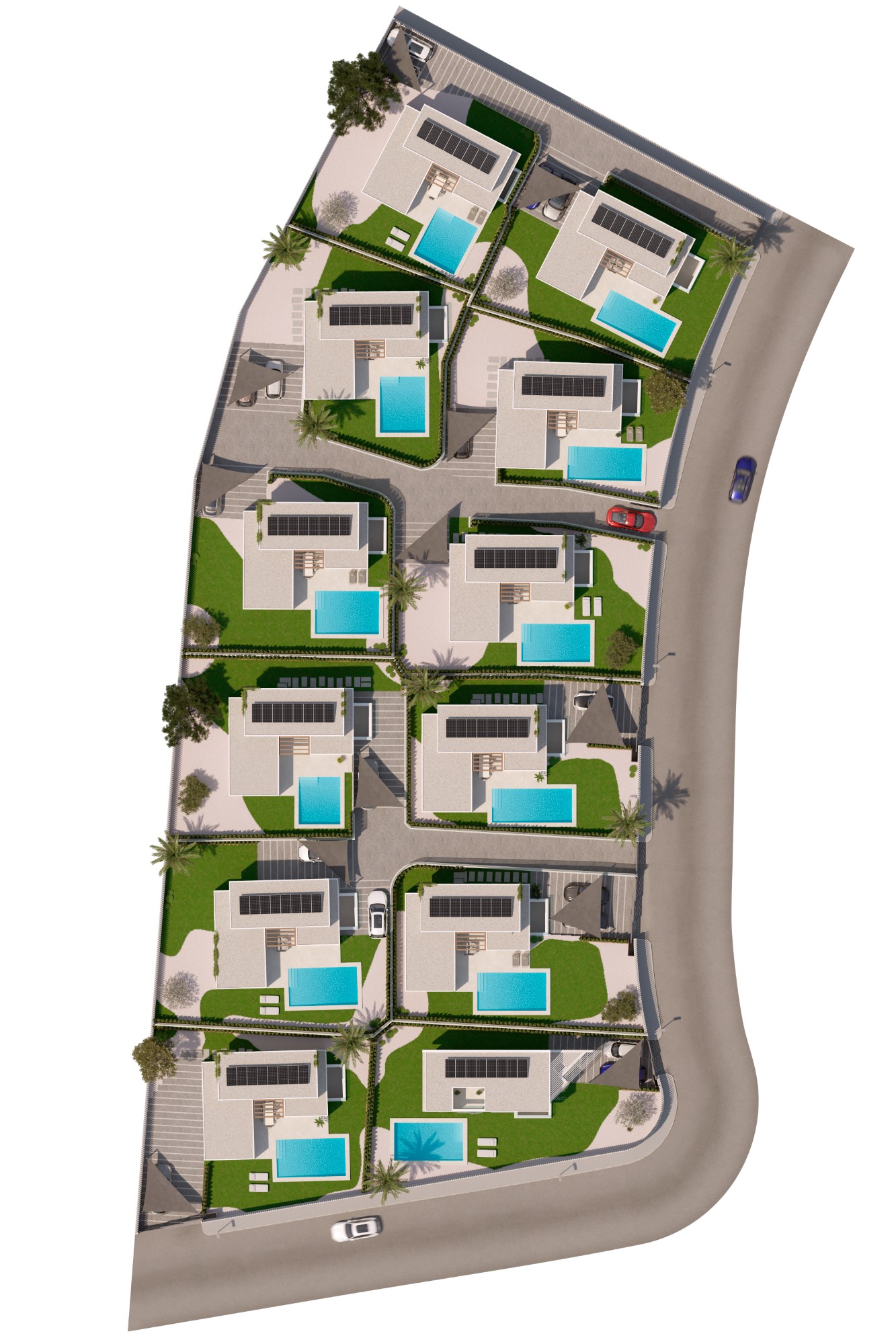 Die Villen bestehen aus einem großen und hellen Wohnzimmer und Küche, die zu einem schönen Garten mit privatem Pool führen.