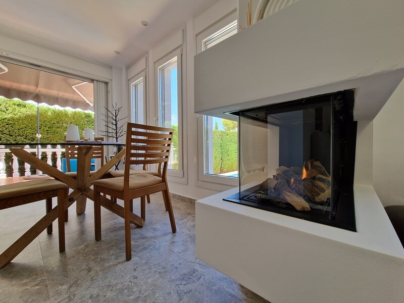 En op de begane grond werd de woonkamer vergroot en werd de keuken volledig vernieuwd en geopend naar de woonkamer. Al het werk was klaar in december 2023, met uitzondering van de open haard, die in januari van dit jaar werd geïnstalleerd.