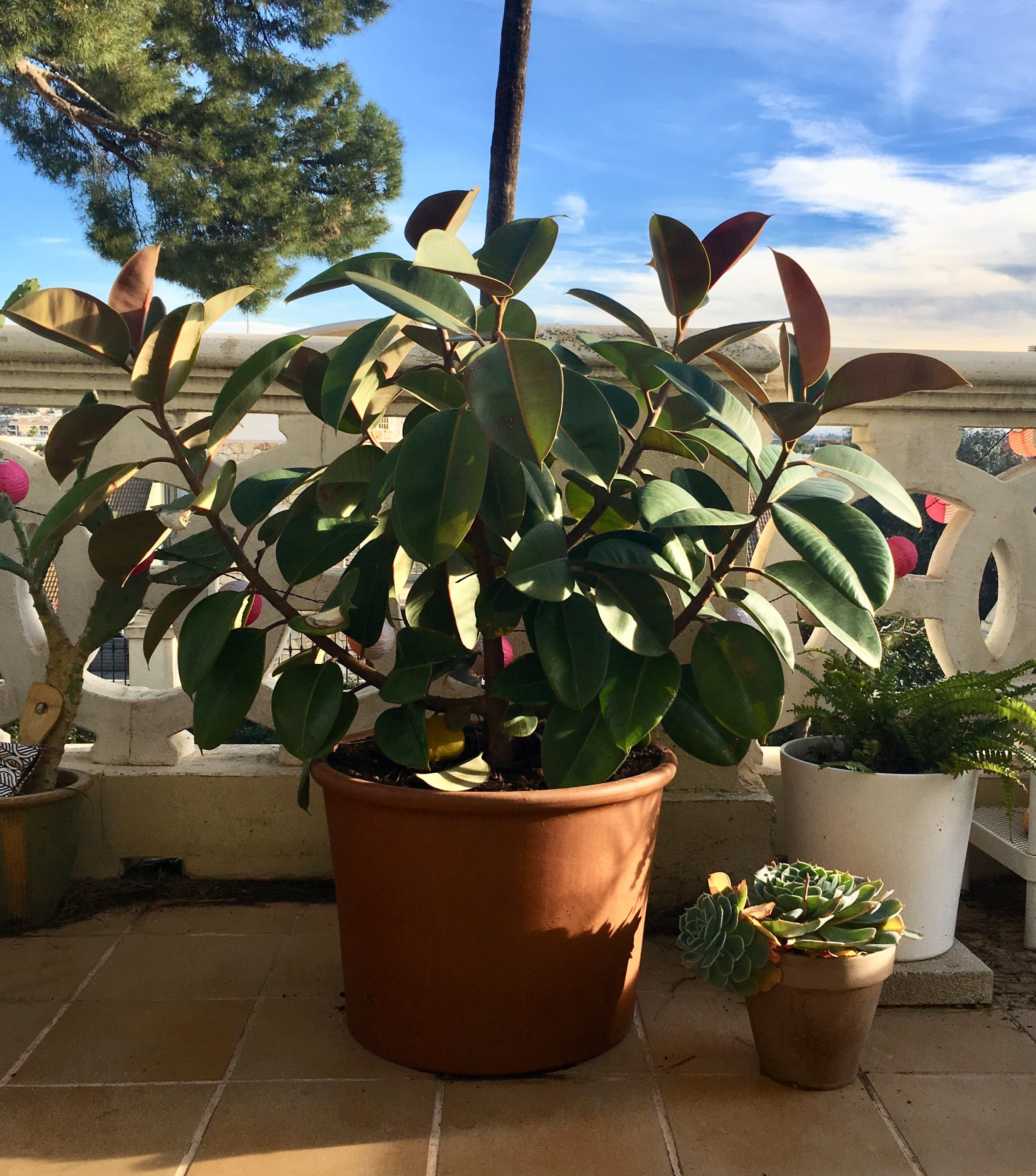 As illustrated above, the low maintenance rubber plant is a fantastic choice for a Spanish terrace. The Ficus Elastica, also called rubber plant, rubber tree or rubber tree plant, is a popular terrace plant in Spain because of its beautiful, robust and waxy leaves. These large plants, which originate in Asia, are available in different varieties and colours. The rubber plant likes just the right amount of sun and water. Rubber plants tell you if they need more sunlight or water if they drop their lower leaves. They prefer bright, indirect sunlight, so don’t put them in the full hot sun all day. These plants need more water in the summer, although do not leave the plant waterlogged. You can prune your rubber plant to keep its shape, promote new growth and keep its size under control. Pruning is possible throughout the year.